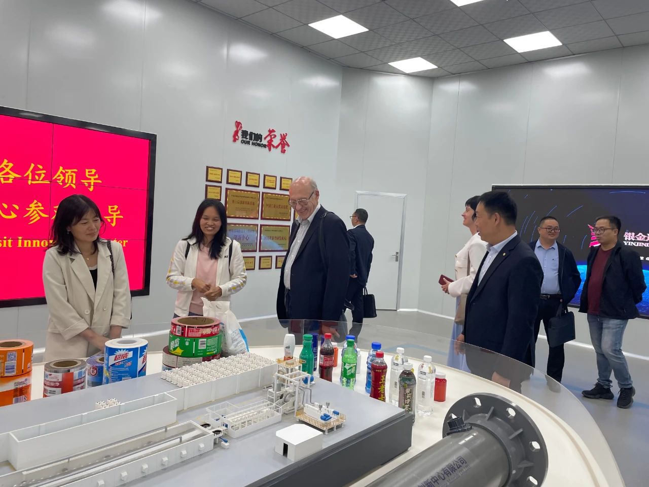 在達(dá)新源生產(chǎn)線夏總向彼得科維奇院士介紹了PETG產(chǎn)品的市場(chǎng)推廣應(yīng)用情況,彼得科維奇院士對(duì)銀金達(dá)PETG產(chǎn)品取得的市場(chǎng)地位感到由衷贊嘆。